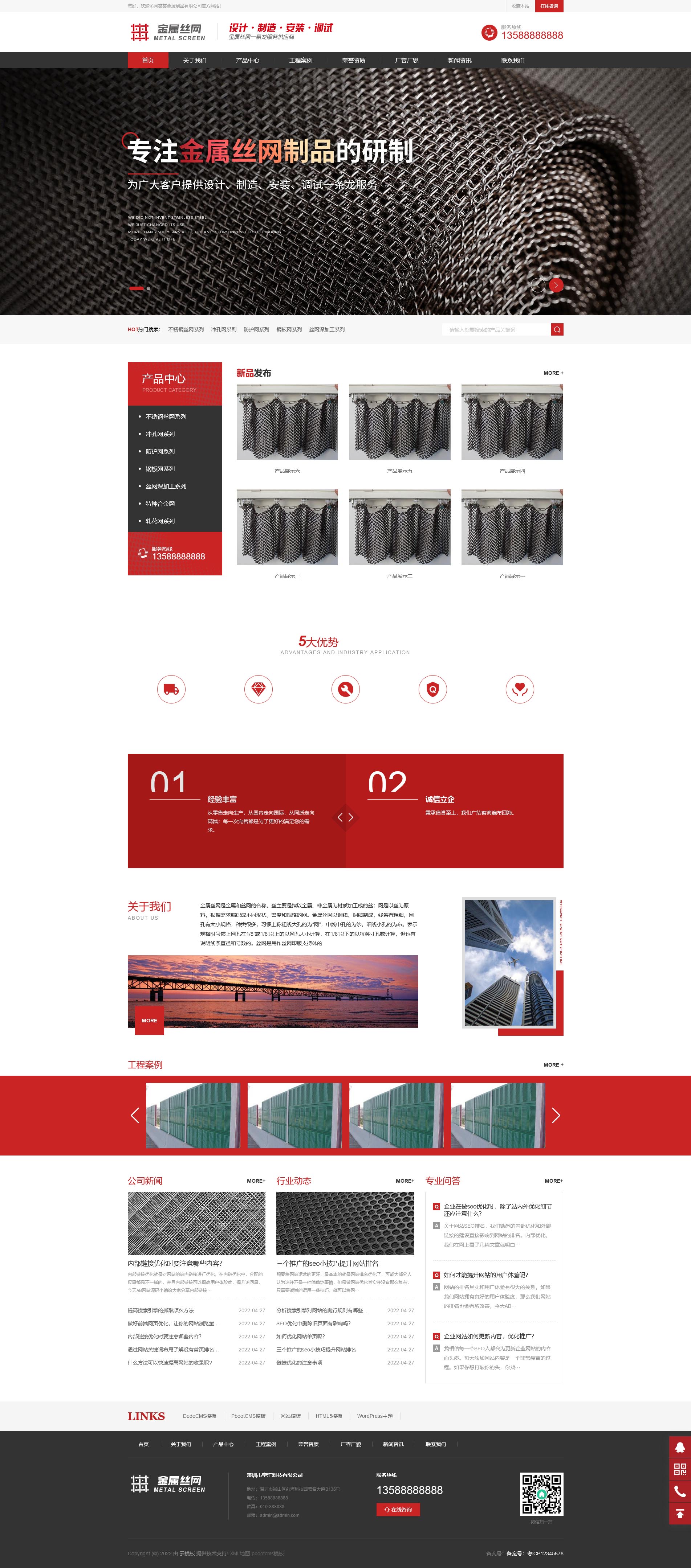 响应式金属丝网滤网金属制品 pbootcms 网站模板,红色和黑色搭配风格,设计大气实用,导航高亮显示带下来子菜单,这是一套响应式自适应手机端网站模板,可在手机端适配。这套 pbootcms 网站模板可以作为金属丝网滤网金属制品公司、金属制品专业加工生产销售公司网站,数据库采用 sqlite 链接方式,将源码上传到网站空间,然后确定自己用的 web 容器是 iis,apache 还是 nginx 导入相应的伪静态规则即可,非常的方便。PC+WAP,同一个后台,数据即时同步,简单适用!附带测试数据!友好的 seo,所有页面均都能完全自定义标题/关键词/描述,PHP 程序,安全、稳定、快速;用低成本获取源源不断订单!